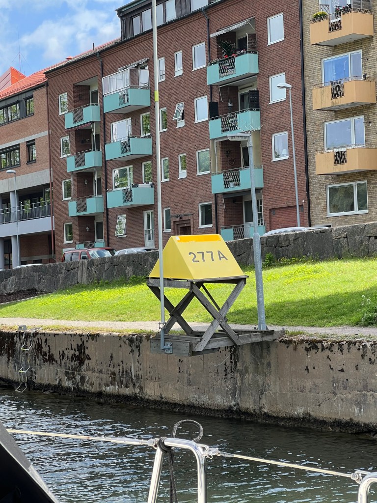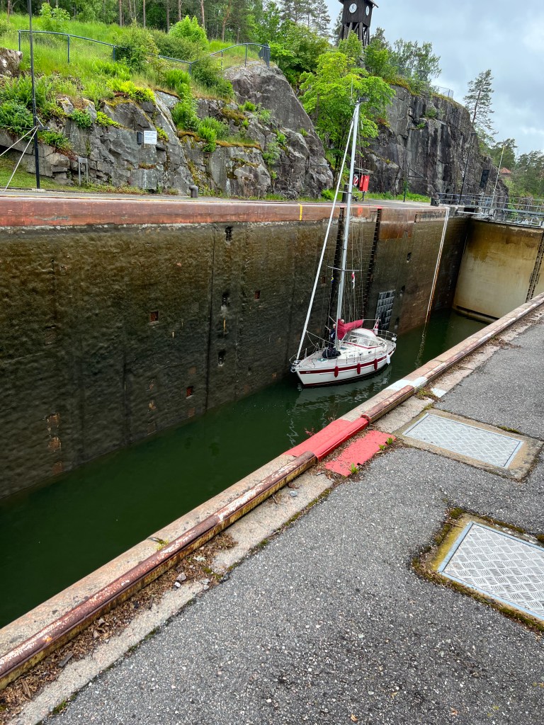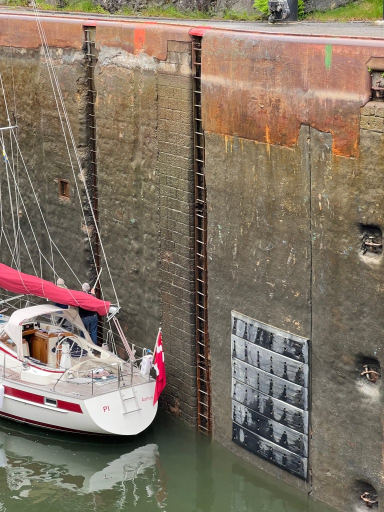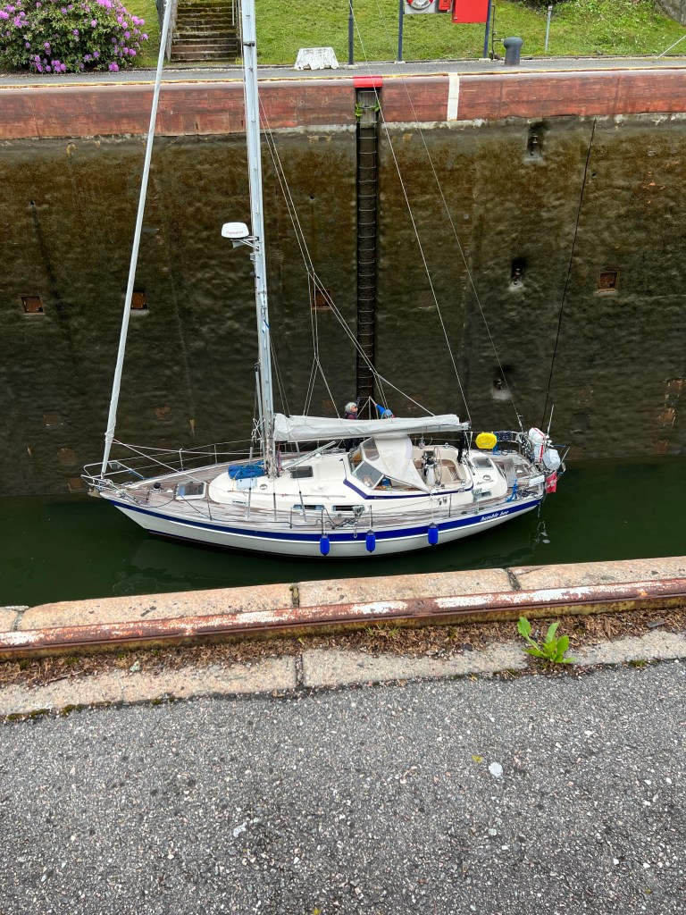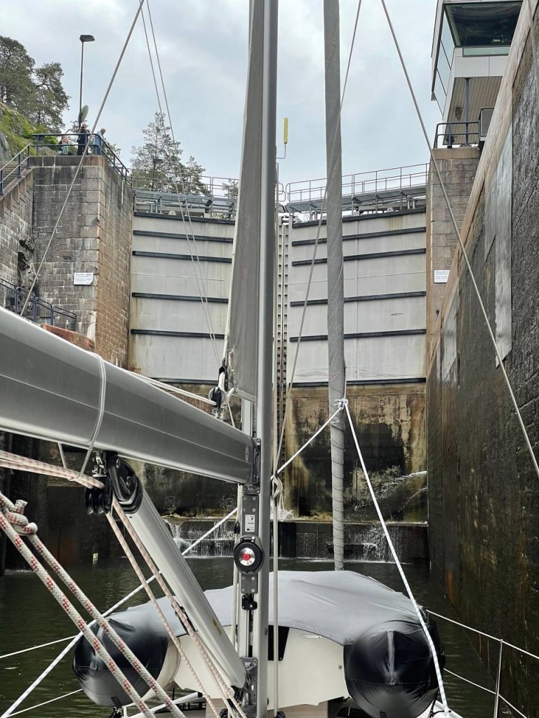 Aber, das hat Brigitte einige Jahre ihres Lebens gekostet. Man stelle sich vor Brigitte wurde von mir nur mit einem Schleusenhacken ausgestattet 🤣 auf den anderen Schiffen wurde mit zahlreichen Leinen am Bug und Heck hantiert. Was macht man dann nur mit einem Hacken ? Doch am Ende hatten wir viel Stress weniger als alle anderen, hat der Skipper doch einmal Recht. So gut wie die erste Schleuse lief, haben wir gar nicht aufhören können. So haben wir gleich die nächsten in Angriff genommen, sogar eine dreifach Schleuse und zum Abschluss noch wieder eine einzelne Schleuse. Somit haben wir uns auf 37 m über den Meeresspiegel bringen lassen. Die fehlenden ca. 60 m schaffen wir auch noch. Der Tag war somit um 20:30 h beendet in Trollhätten.