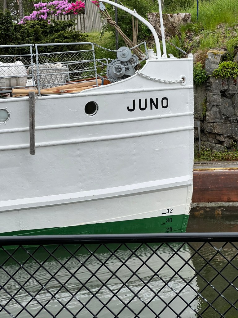 Da sitzen wir schön beim Kaffee und was sehen wir, die JUNO! Mit diesem Schiff hatten wir jetzt noch nicht gerechnet, aber trotzdem schön. So nahe wie in der Schleuse kommen wir ihr bestimmt nicht mehr für Fotos. Das nächste mal im Göta Kanal.