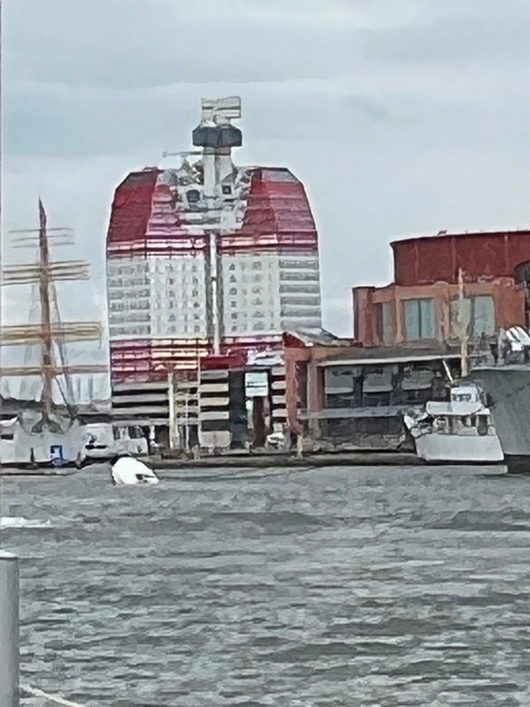 Und auch die Hängebrücke Älusborgsbron, die in der Hafeneinfahrt den Göta älv überquert. Die Höhe beträgt 45,00 m und die Spannweite ist 418 m, die Gesamtlänge dieser Brücke beträgt 933 m. Sie hat 6 Fahrspuren, die an 2 Pylonen hängen die 107 hoch sind. Am Tag überqueren diese Brücke 65.000 Autos. Vor bei an den Fähren der Stena Line kommen wir unserem Ziel Lilla Bommen näher.