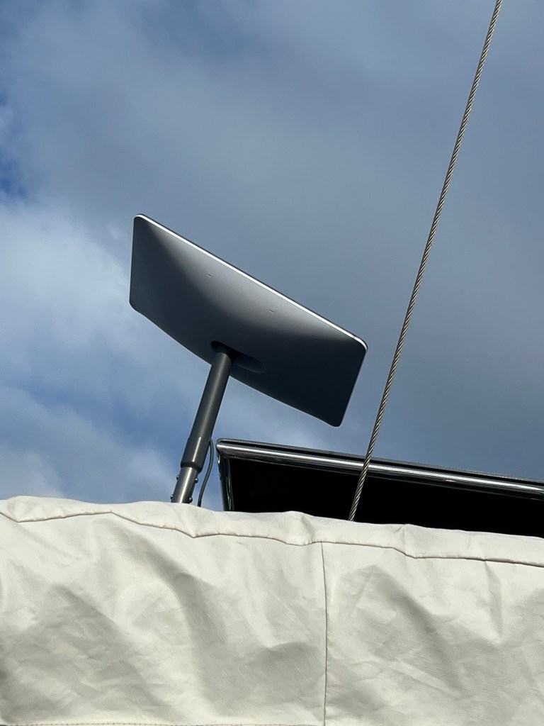 Und hier noch unsere neuste Anschaffung. Starlink, unsere neue Verbindung mit Euch über Satelliten.