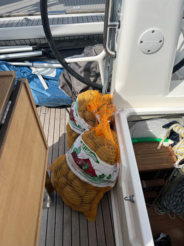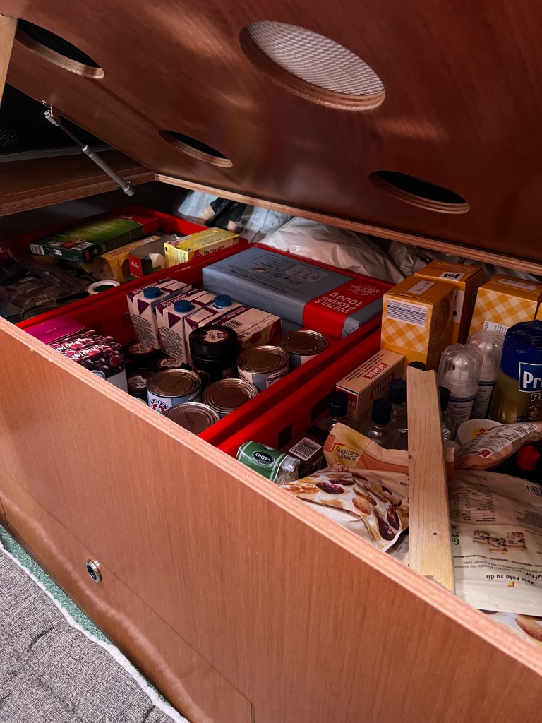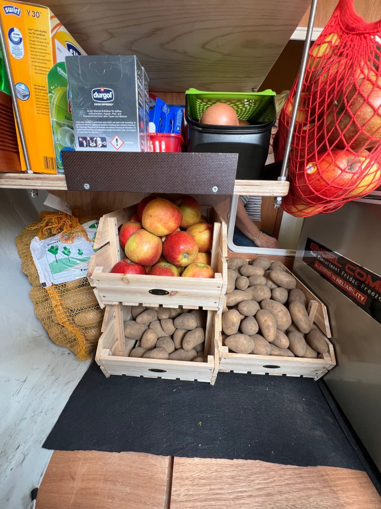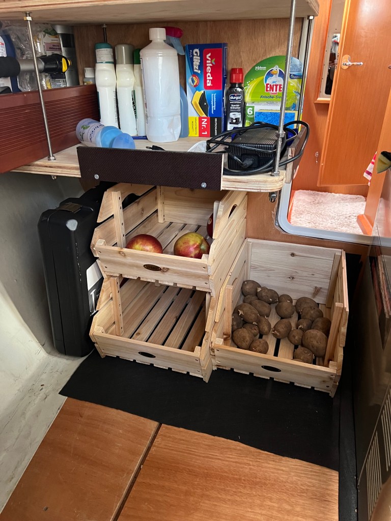Jetzt kommt auch schon das Obst und Gemüse an Bord. Und schon ist es ordentlich verstaut.