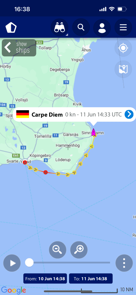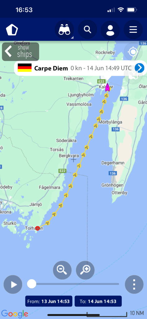 Bei schlappen achterlichen Wind müssen wir den Dieselwind etwas mitlaufen lassen. 😉 Aber im laufe des Tages wurde der Wind etwas stärker, so daß wir ganz gut voran gekommen sind. Kalmar haben wir gegen 16:15 erreicht. Aber ! Der Hafen ist voll, der Hafenmeister fängt uns schon außen ab. Wir sollen hier im vorderen Hafen einen Platz suchen. Gesagt getan. Und dann kam ein Segler, der mit einem Schwung, in den von uns anvisierten Platz rein stürmte. Ich glaube, ich bin in einem schlechten Film. 🤮 Egal jetzt kommt unsere Technik voll zum Einsatz. Mit Bug und Heckstrahlt wird die Carpe Diem gedreht und gekonnt in die kleine Lücke manövriert. 😜