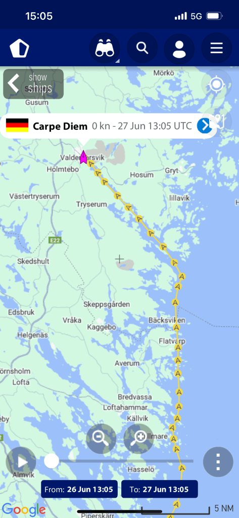 Wir sind heute auf dem Weg nach Valdemarsvik, ein Hafen der soweit der üblichen Route liegt das man ihn nicht anläuft. Der Umweg beträgt 20 sm, das macht man eigentlich nicht.