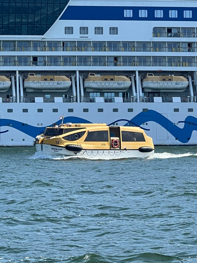 Fleißig wurde ausgebootet. Die Passagiere wollen an Land gebracht werden, einen Anleger für dieses Schiff gibt es hier nicht. 🥹