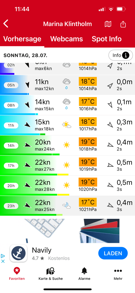 Ach ja, das mit einer Geraden hatten wir schon. Na dann! Die Windvorhersage sagt für morgen anhaltenden Südwind voraus. Das gibt es nicht sehr oft um diese Jahreszeit. Darum wollen wir das ausnutzen und versuchen, sehr weit nach Westen zu kommen. Mal sehen wie weit wir kommen werden. Dazu dann später mehr. 👍